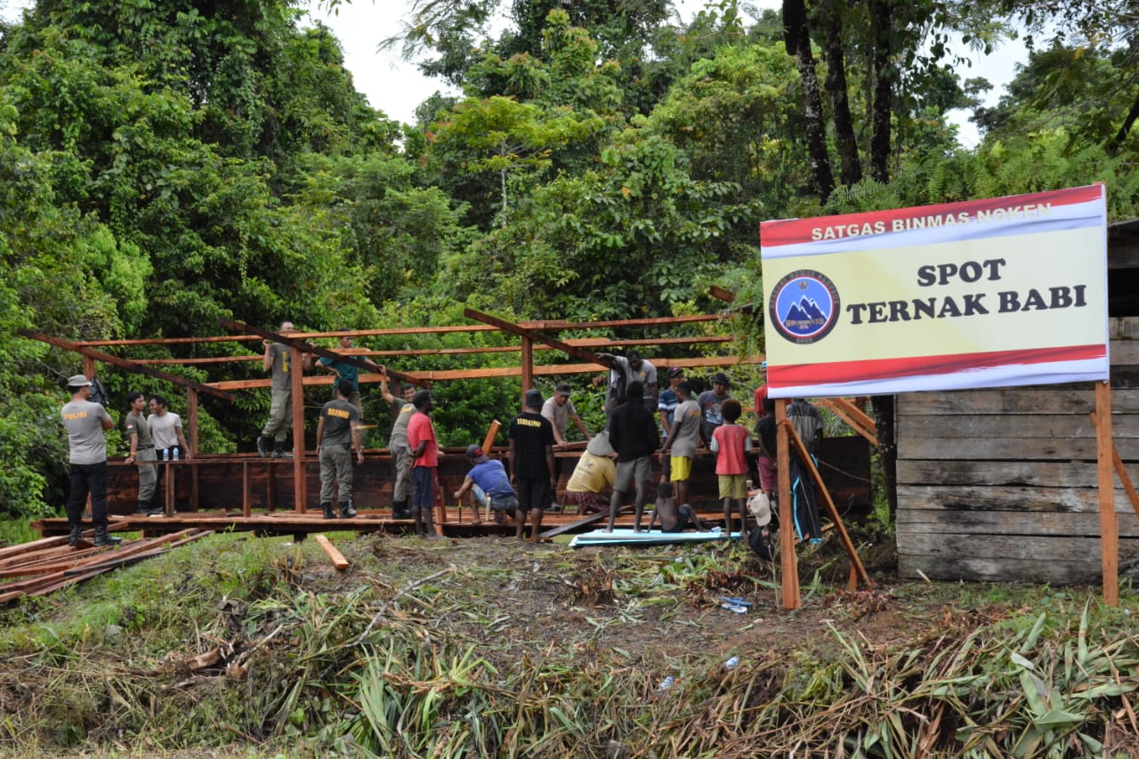 Yahukimo – Bersama Masyarakat, Satgas Binmas dan Satgas Preventif yang tergabung dalam Ops Damai Cartenz-2022, bersama-sama membangun kandang ternak Babi di Spot Peternakan Babi, Kampung Moruku, Distrik Dekai, Minggu (15/5/2022).
