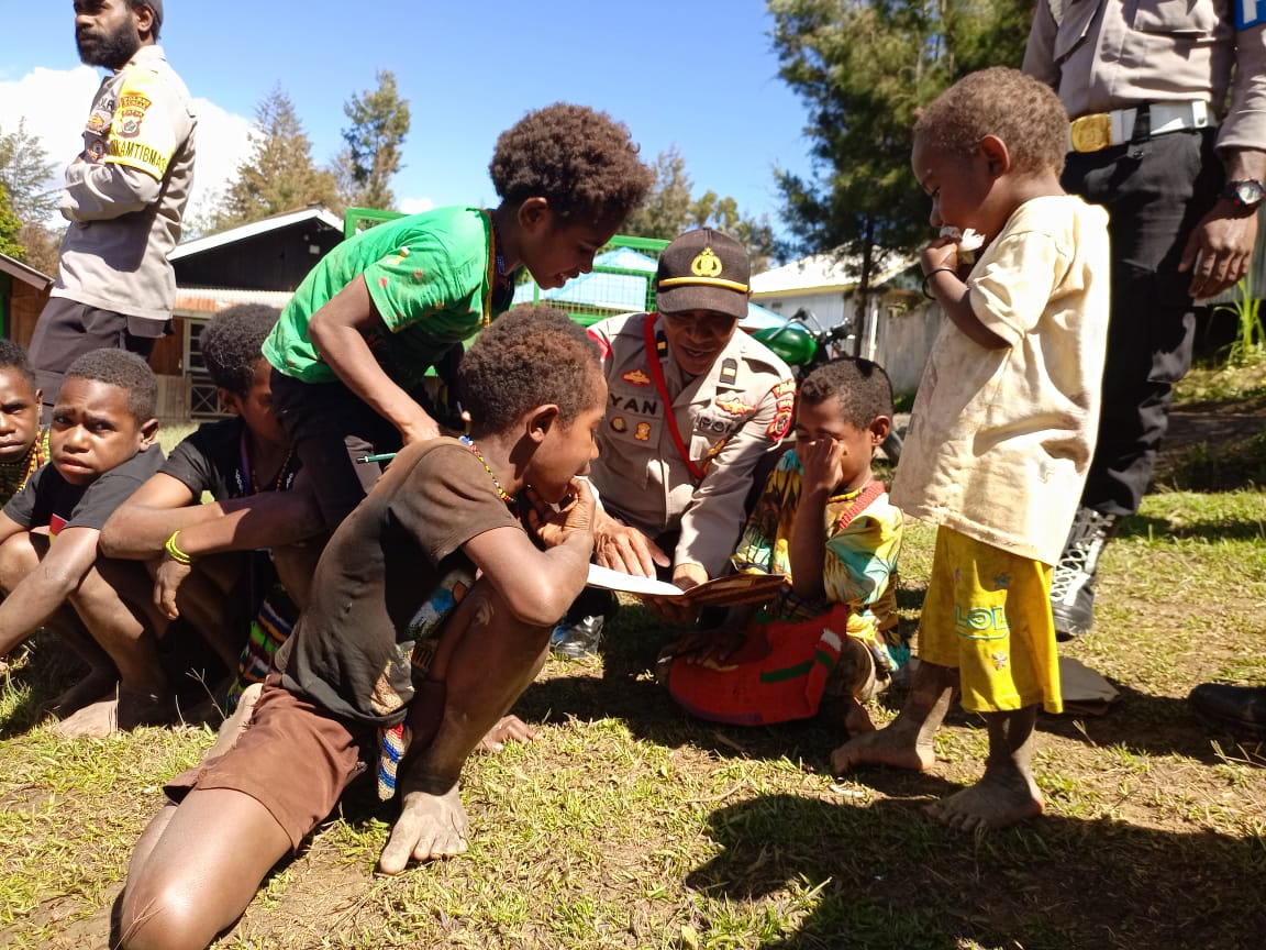Sehingga Polri khususnya Satgas Binmas Ops Damai Cartenz pada hari Kamis, (28/07/2022) tergerak hatinya untuk mengajarkan membaca dan menulis kepada anak-anak di Kampung Kago Kabupaten Puncak Papua.