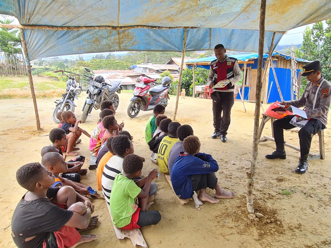 “Kita bagikan permen kepada anak-anak, terutama bagi yang bisa menjawab pertanyaan pelajaran yang lalu, agar mereka lebih termotivasi,”ungkap Iptu Jufri Rambu.