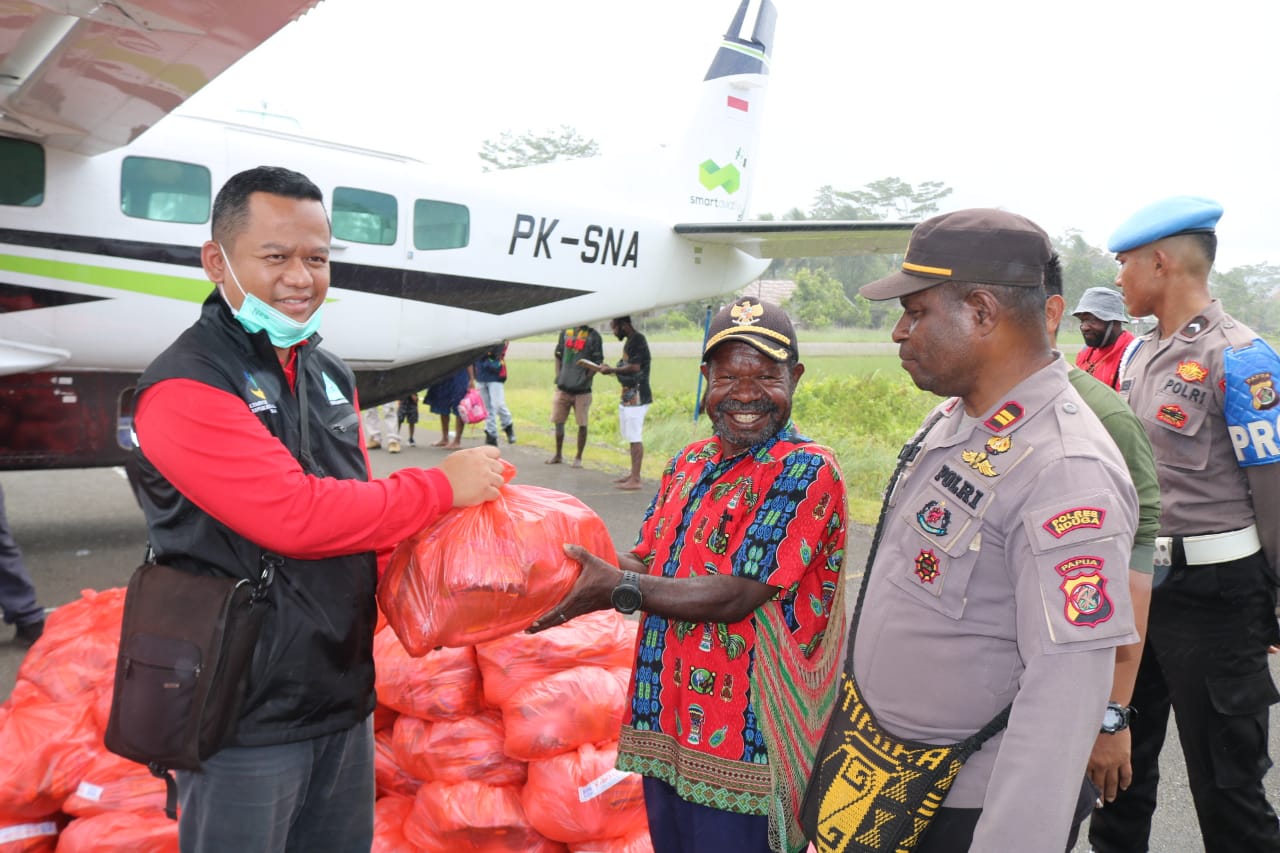 Kapolres Nduga AKBP Rio Alexander Paranawen menambahkan kami atas nama pemerintah Kab. Nduga mengucapkan terima kasih yang sebesar besarnya kepada pemerintah pusat yang telah memberikan sembako dan hari ini telah tiba di Bandara Kenyam yang selanjutnya akan kami salurkan kepada warga yang ada di Kabupaten Nduga.