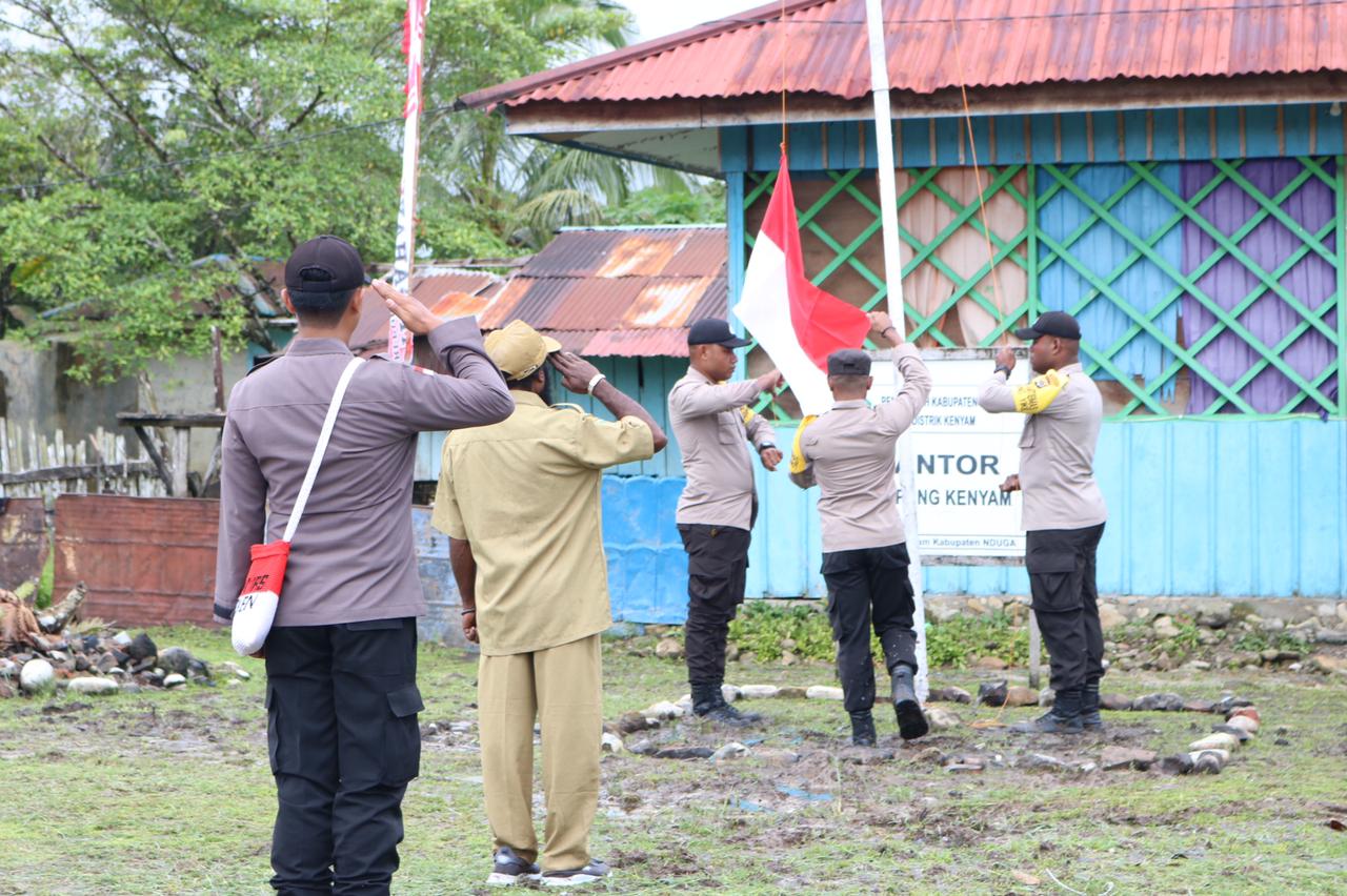 Kenyam- personil Binmas polres Nduga dan bapak Arius Mijele sebagai kepala kampung Kenyam, melaksanakan upacara bendera sebagai wujud cinta tanah air Indonesia, Rabu(17/08/2022).