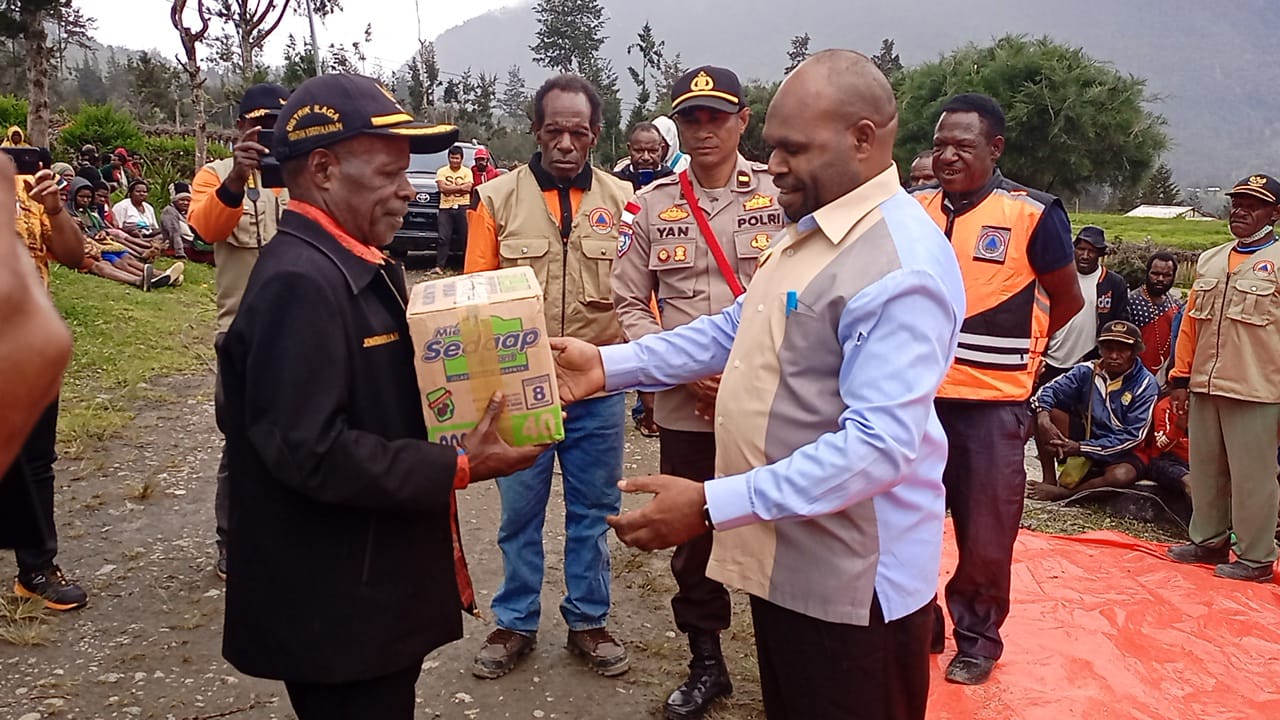“Kita ketahui bersama bahwa perekonomian masyarakat disini sedang mengalami kekacauan dan dengan keadaan yang terjadi ini kami dari Pemerintah Daerah memberikan bantuan berupa beras, mie, handuk, selimut, dan sabun yg kami bagi ke masing-masing Distrik kemudian ke Kampung dan nanti dibagikan kepada setiap warganya, “kata Pelinus.