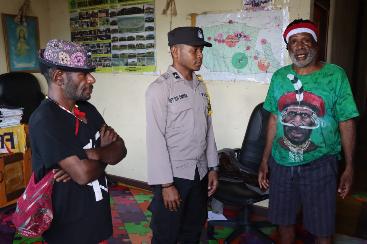 Kenyam – Dalam rangka menjaga Kamtibmas tetap aman dan kondusif, Satgas Binmas melaksanakan program Koteka (Komunikasi Tokoh Elit Kamtibmas) dengan menyambangi Bapak Ruben Kalolik selaku Tokoh Adat Kepala Suku Nduga Distrik Kenyam Kabupaten Nduga, Senin (29/08/2022).