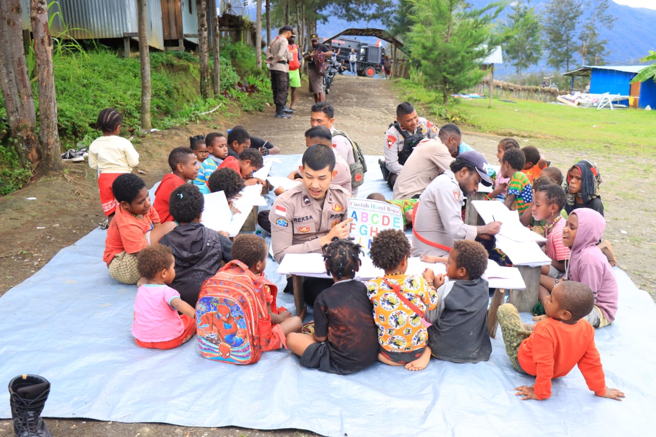 Korwil Binmas Wilayah Puncak Ipda Yan A Wambraw, S.Sos bersama personil Satgas Binmas dan Satgas Preventif Ops Damai Carten pada kali ini mengajarkan anak – anak membaca dan menulis yang bertempat di Kampung Kago Distrik Ilaga Kabupaten Puncak.