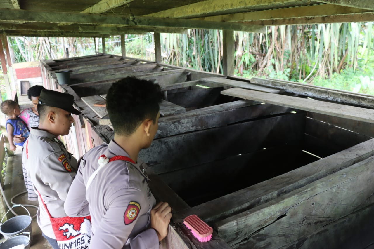 Dalam kegiatan tersebut, personel Satgas Binmas mendatangi warga binaan dan mengecek kondisi ternak babi serta kandangnya.
