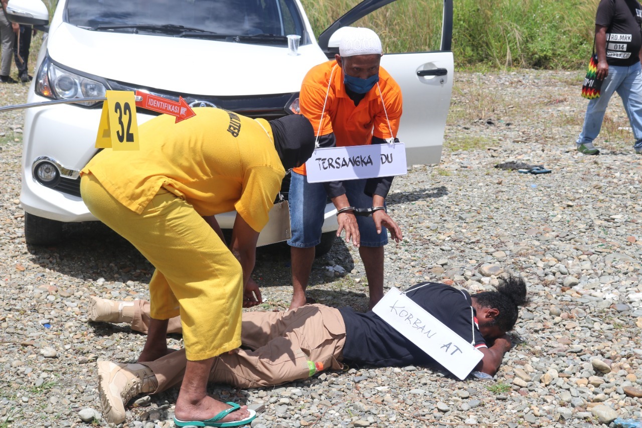 Jayapura – Sat Reskrim Polres Mimika menggelar rekontruksi pembunuhan dan mutilasi di Kabupaten Mimika hari ini di Jalan Budi Utomo Ujung, Sabtu (3/9). Polres Mimika yang di dukung Polda Papua mengundang Komisi Kepolisian Nasional (Kompolnas) dan Komisi Nasional Hak Asasi Manusia (Komnas HAM) Papua.