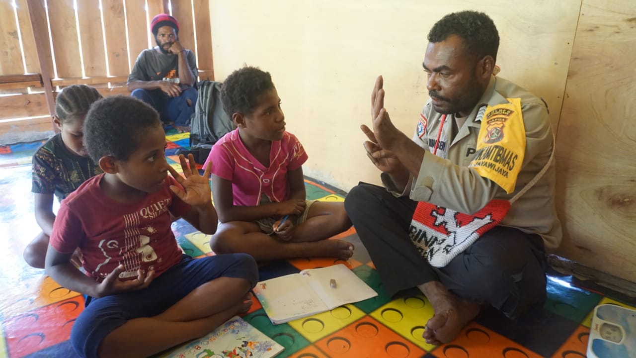 Wamena – Binmas Noken Jayawijaya terus Rangkul Anak-anak di Kampung Parema dengan belajar dan bermain bersama melalui Program SI-IPAR ( Polisi Pi Ajar ) yang merupakan salah satu program unggulan Binmas Noken untuk Kemajuan Pendidikan Anak-anak di Papua.