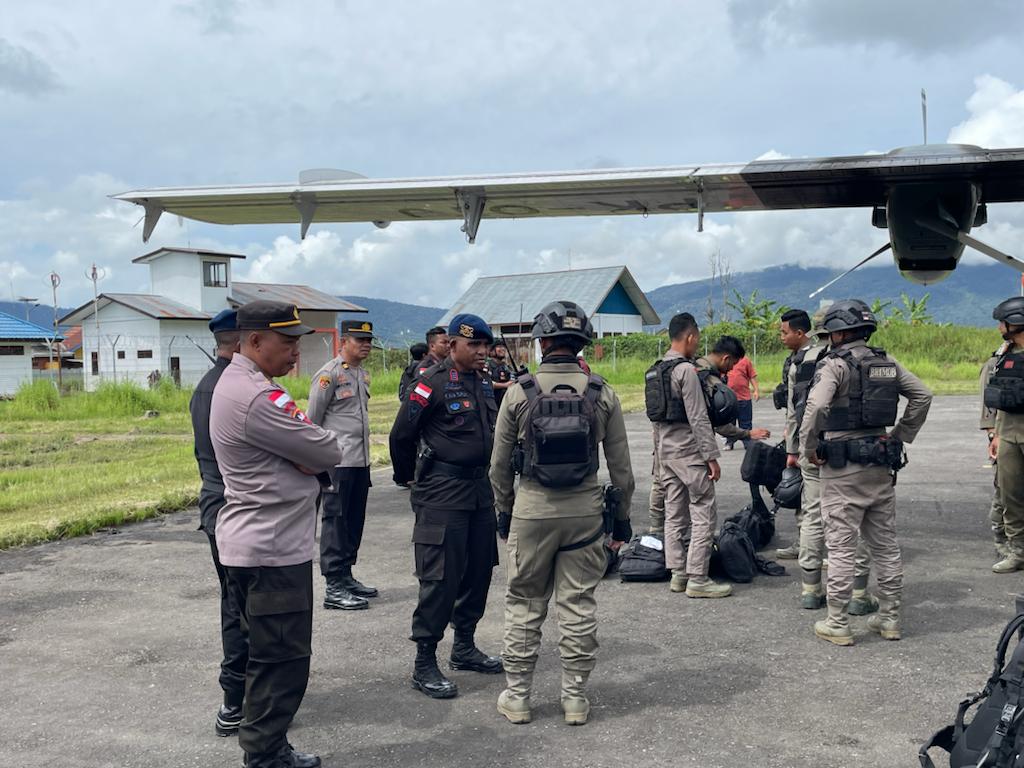 Dogiyai – Kasatgas Siber Kombes Pol Bambang Widyatmoko, S.H bersama Waka Satgas Binmas Kombes Pol Yamin Dian Prino dan anggota Satgas Preventif dan Satgas Binmas tiba di Kabupaten Dogiyai Papua.