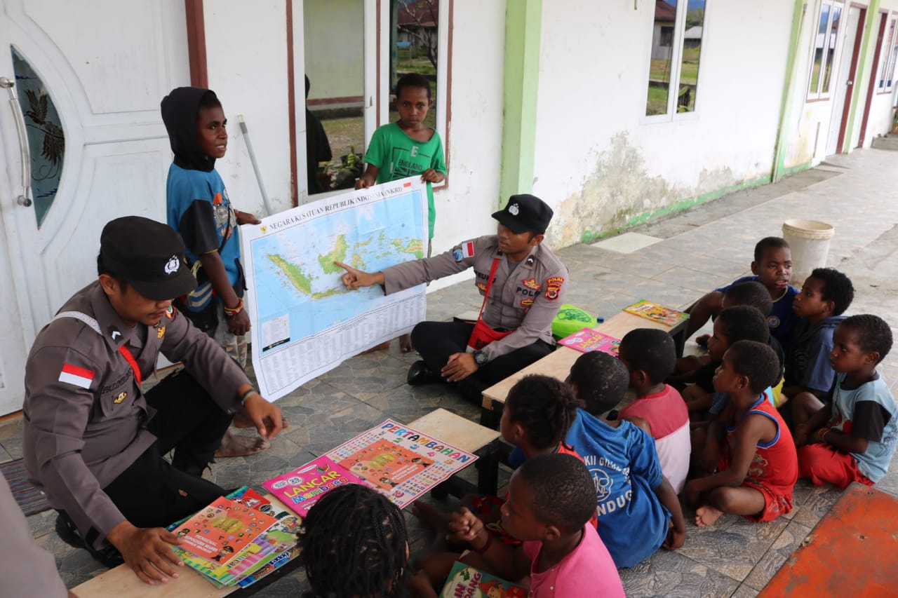 Kenyam- Program SI-IPAR (Polisi Pi Ajar) kembali di gelar kali ini personil Binmas Noken di bawa pimpinan Ipda Murtono sebagai Kakorwil Nduga, belajar, bernyanyi dan bermain bersama anak-anak kampung Kenyam Kab Nduga Kamis (08/09/2022).