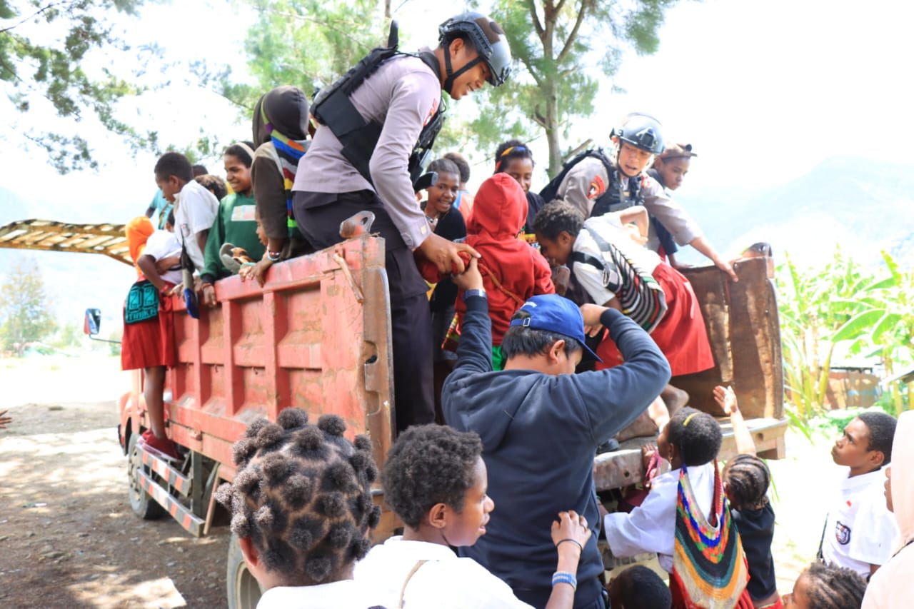 Satgas Preventif Ops Damai Cartenz 2022 wilayah Puncak yang dipimpin oleh Ipda Ade Hidayat rutin memberikan tumpangan bagi para anak-anak yang hendak pergi dan pulang dari aktivitas belajar mengajar yang diadakan personel dari Binmas Noken.