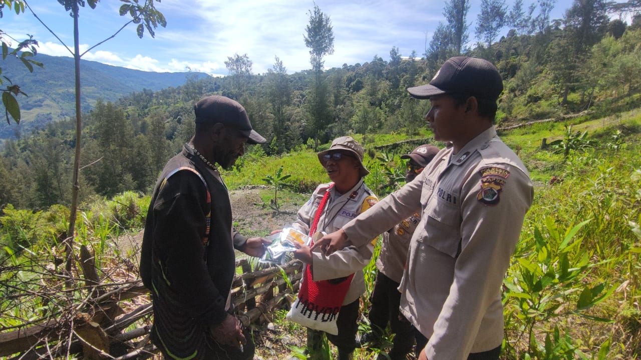 Sugapa – Personel Binmas Noken Intan Jaya yang dipimpin Ipda Engel Mayor Tempuh perjalanan Belasan Kilo serta lewati Hutan Belantara untuk temui Petani Binaannya di Bajemba Kampung Yokatapa Kabupaten Intan Jaya, Selasa (13/09).