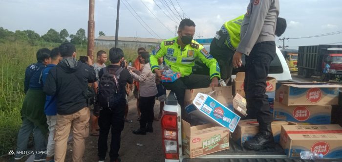 Tampak dilokasi, Kasatlantas Polresta Jambi bersama personil dengan menggunakan Mobil Patroli, langsung membagikan snack dan air mineral, kepada Para sopir truk angkutan Batubara, angkutan cangkang, CPO dan juga warga.