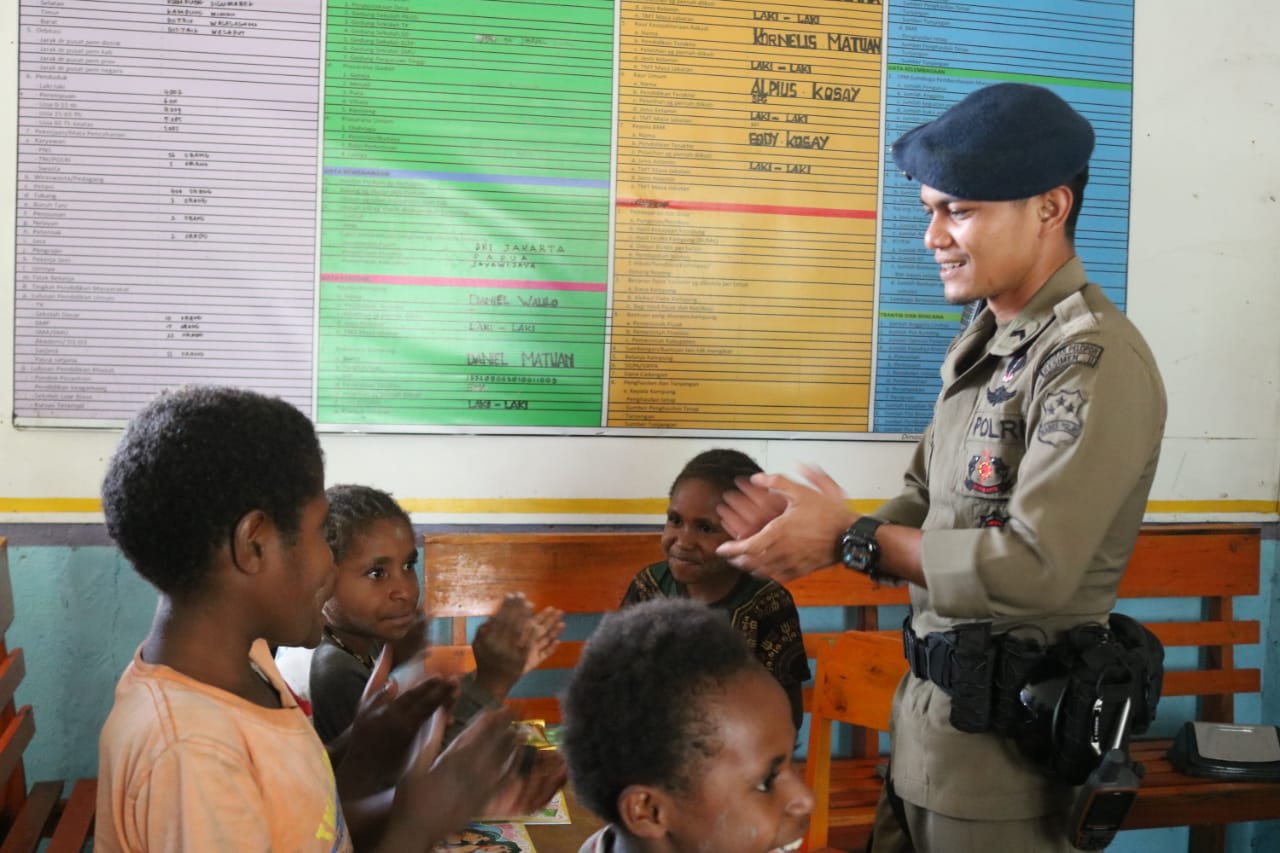 “Sebelum kegiatan dimulai, personel di lapangan mengajak anak-anak untuk bernyanyi dan bermain agar mereka semangat dalam mengikuti pembelajaran yang akan dilaksanakan,” ujar Iptu Made Sujana.