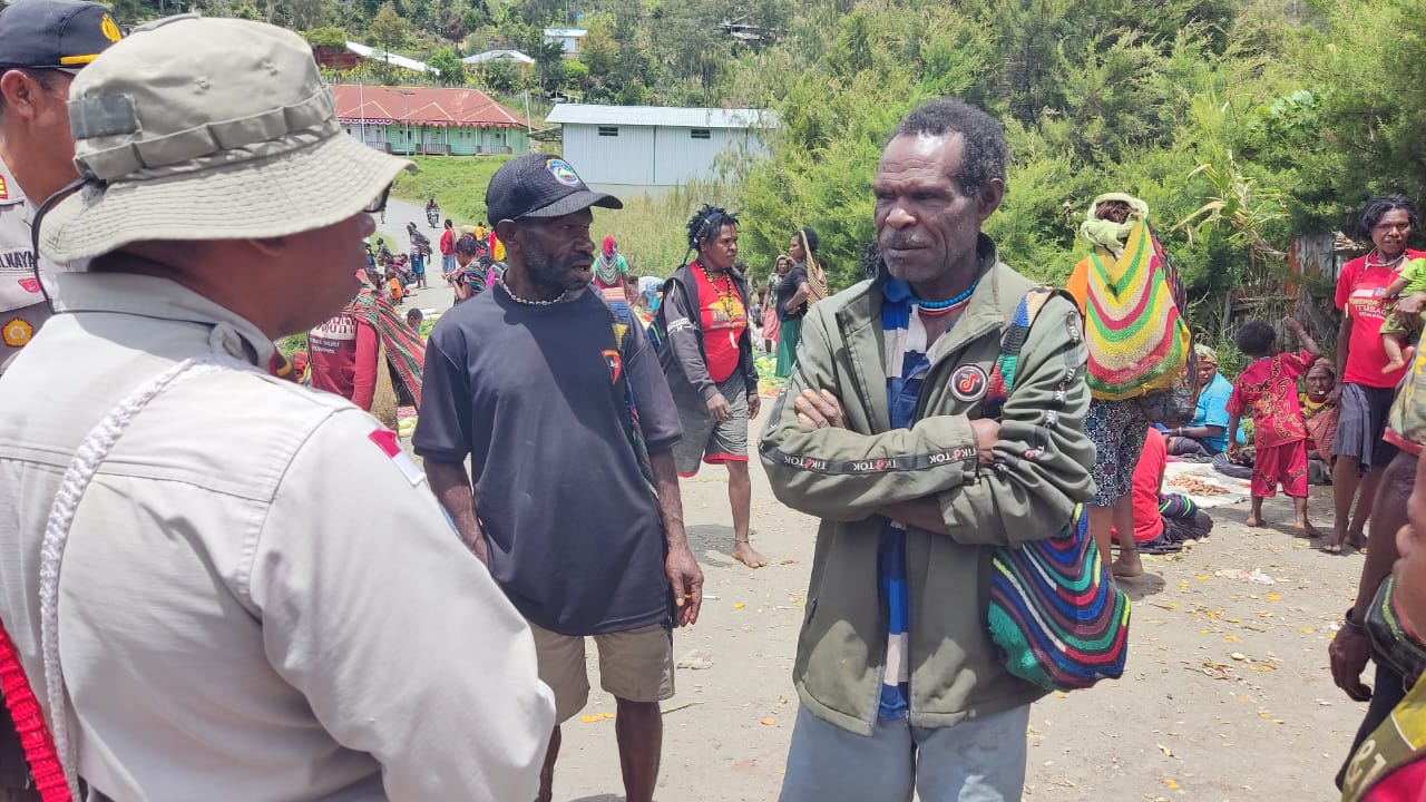 Sugapa – Binmas Noken wilayah Intan Jaya yang dipimpin Ipda Engel Mayor menyambangi Pendeta GKII Bajemba Daud Zanambani, Minggu (18/09).