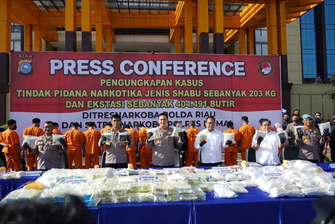 Pekanbaru – Polda Riau berhasil menggulung 16 tersangka komplotan narkoba dengan barang bukti sebanyak 203 kilogram sabu dan 404.491 butir pil ekstasi. Pengungkapan itu dilakukan dalam kurun waktu 4 hari saja (11-14 September 2022), berkat kerja sama Direktorat Reserse Narkoba (Ditnarkoba), Polda Riau bersama Direktorat Intelkam dan Polres Dumai. Kapolda Riau Irjen Moh Iqbal menegaskan, pengungkapan kasus ini merupakan prestasi terbesar di Polda Riau.