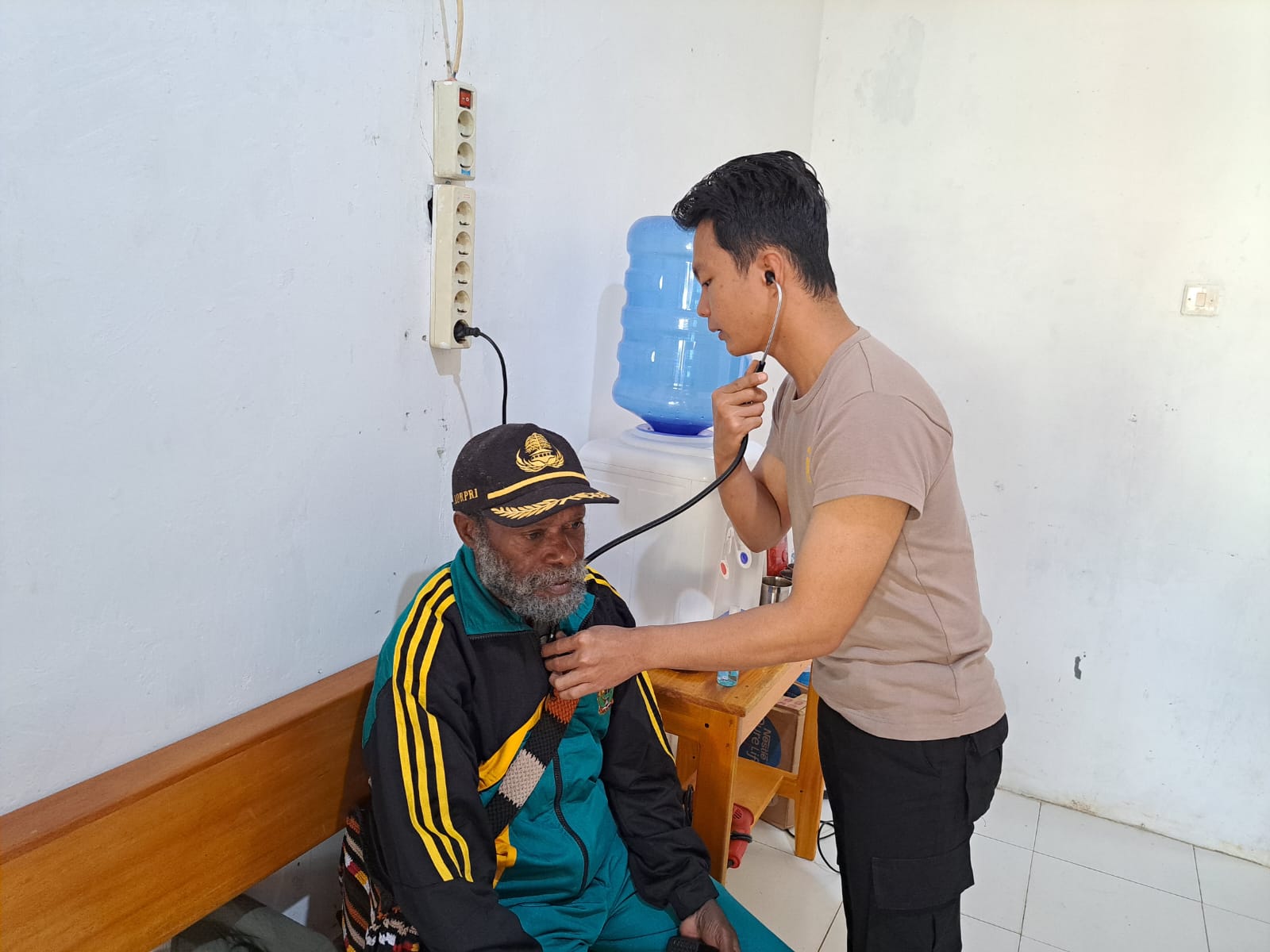 Dogiyai – Tim Medis Binmas Noken yang dipimpin Ipda dr. Ashari Zuprin selaku Katim melakukan pengobatan kepada Bapak Evisus Awe yang mengalami sakit pada bagian dada yang bertempat di Mako Polres Dogiyai, Kabupaten Dogiyai, Rabu (21/09).