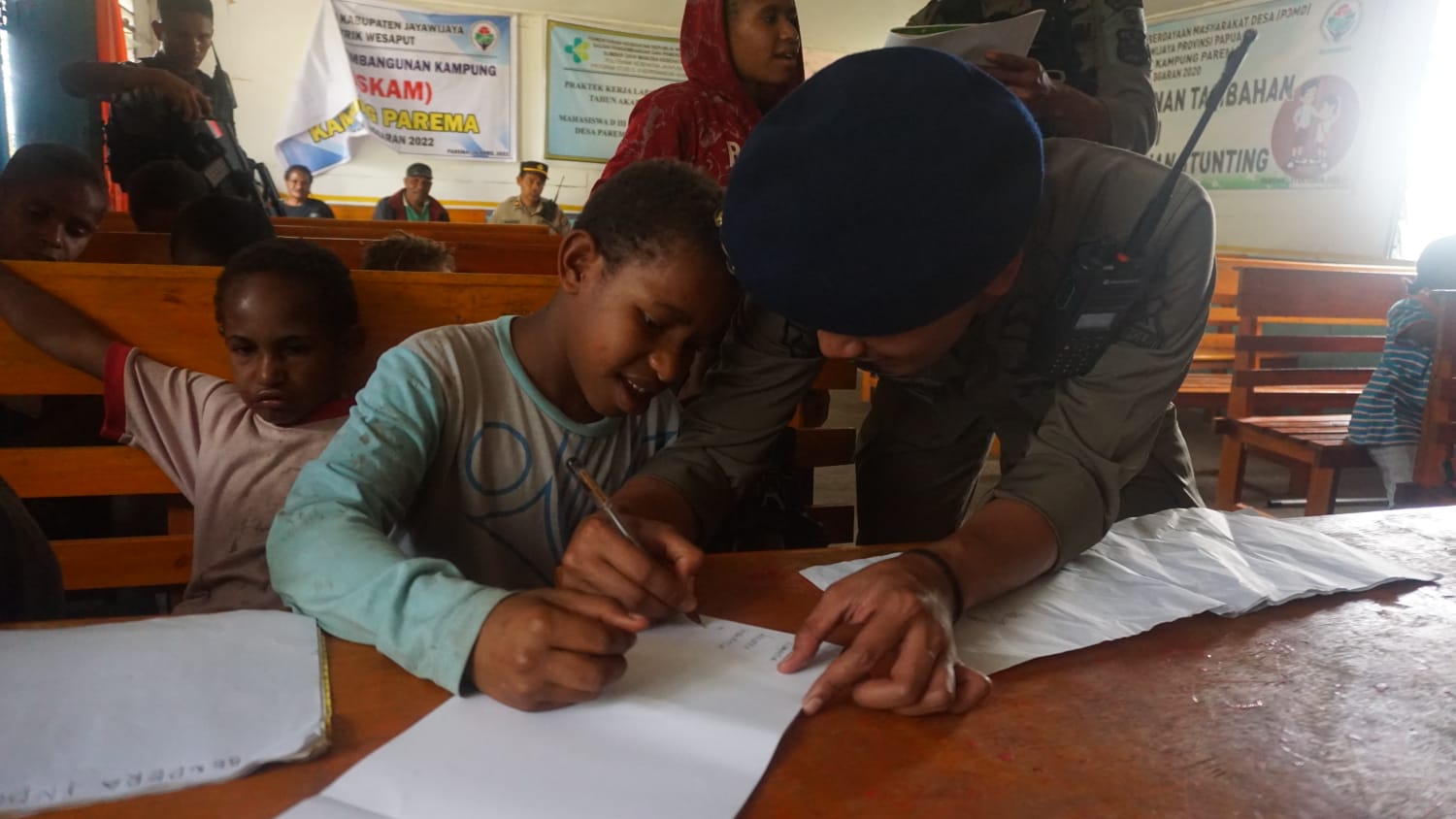 Wamena – Binmas Noken Jayawijaya bersama Brimob Nusantara Berikan Kebahagiaan melalui kebersamaan dalam belajar membaca dan menulis bersama anak-anak Kampung Parema.