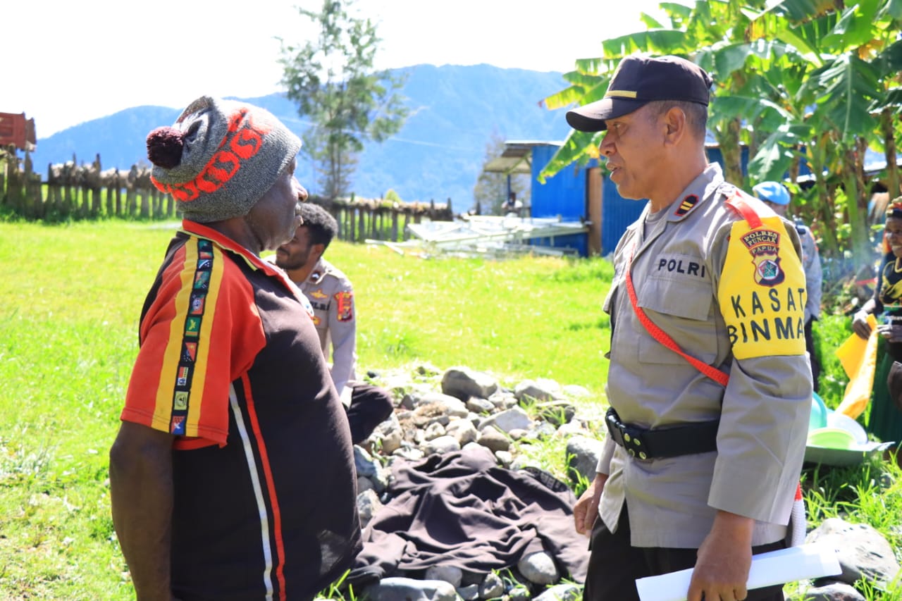 Kasat Binmas Polres Puncak Iptu Yonias Purwanto bersama personil Binmas Noken Polri mengajak Bapak Yan Alom untuk bersama-sama dengan Polri dalam menjaga Kamtibmas bersama, agar situasi di wilayah Puncak tetap aman kondusif.
