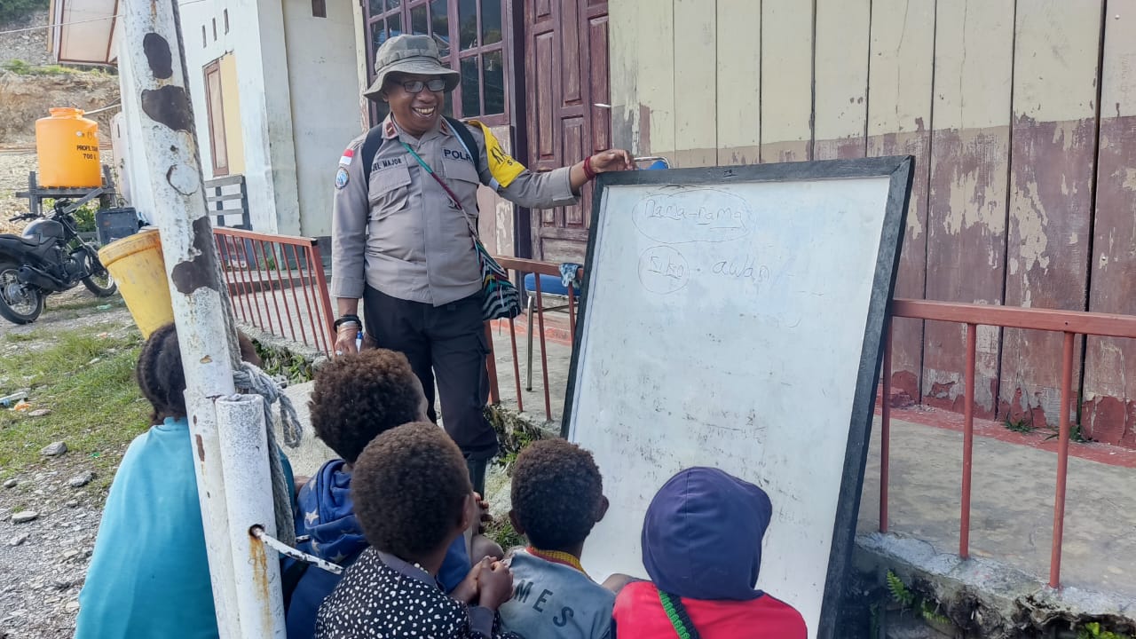 Sugapa – Anggota Binmas Noken Polri Ipda Engel Mayor melaksanakan program Polisi Pi Ajar di Kampung Yokatapa, Distrik Sugapa, Kabupaten Intan Jaya, Papua, Senin (26/09/2022).
