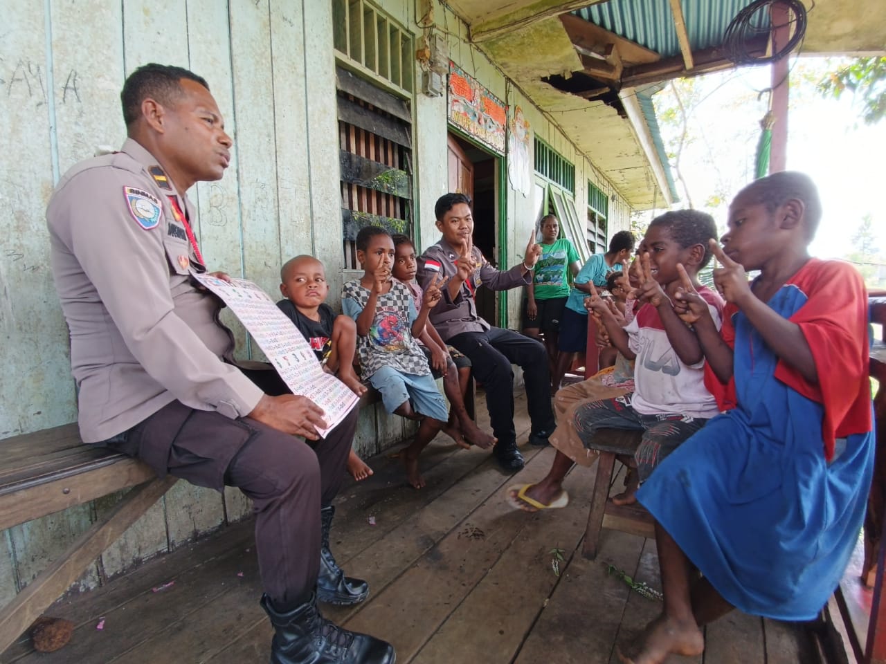 Pada saat itu Ipda Nus Korwa dan Bripda Jetwin memberikan materi dasar pengenalan huruf dan berhitung. Hanya dengan bermodalkan poster abjad dan soal-soal berhitung dasar, Anak-anak semangat mengikuti pelajaran yang disajikan tim binmas Noken. Terlihat mereka dapat menerima dengan baik pelajaran yang diberikan, pada sela-sela pembelajaran juga ada permainan-permainan agar suasana pembelajaran menjadi menyenangkan.