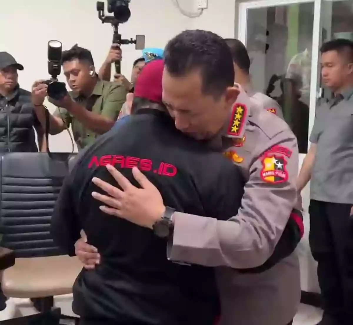 Tak berselang lama, Kapolri memeluk salah satu keluarga korban. Anggota keluarga tersebut tampak menangis di pelukan Kapolri.