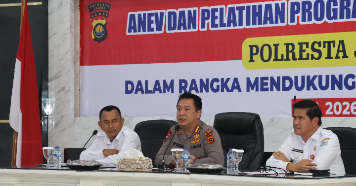 JAMBI – Guna mendukung program pemerintah dalam meningkatkan ketahanan pangan nasional, Kapolresta Jambi, Kombes Pol Boy Sutan Binanga Siregar, S.I.K.,M.H. secara langsung memimpin kegiatan Analisa dan Evaluasi (Anev) dan pelatihan program penggunaan aplikasi ketahanan pangan yang diikuti oleh para Bhabinkamtibmas jajaran Polresta Jambi, bertempat di Ruang Aula Lokamanginti Mapolresta Jambi, Rabu (04/02/2026).